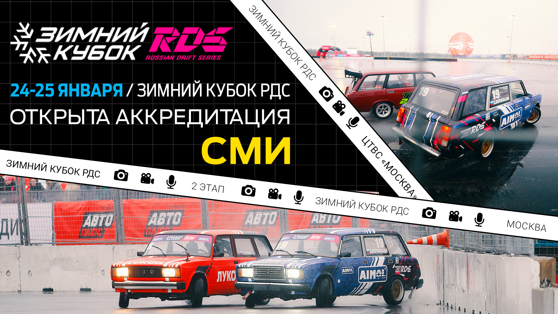 Команда Российской Дрифт Серии начинает аккредитацию прессы на второй этап Зимнего Кубка РДС, который пройдёт в столице на территории Центра технических видов спорта "Москва” с 23 по 25 января.